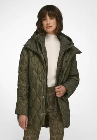 Jacke von BASLER mit 1/1-Arm und modischem Westeneinsatz. Angenehm warm, leicht und soft aus wasserabweisender Qualität mit dekorativer Steppung. Mit angesetzter und mit einem Druckknopf hochschließbarer Kapuze, Druckknopfverschluss sowie 2 schrägen Reißverschluss-Taschen am etwas kürzeren Vorderteil. Der Westeneinsatz mit Frontreißverschluss und Tunnelzug mit Bindeband am Stehkragen kann abgezippt werden, sodass dieses lässige Fashion-Piece sowohl in der Übergangszeit als auch an eisigen Wintertagen ein idealer Begleiter ist. Oberstoff und Futter aus 100% Polyester. Länge ca. 80 cm. Diese Jacke ist maschinenwaschbar.