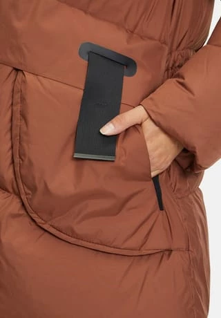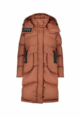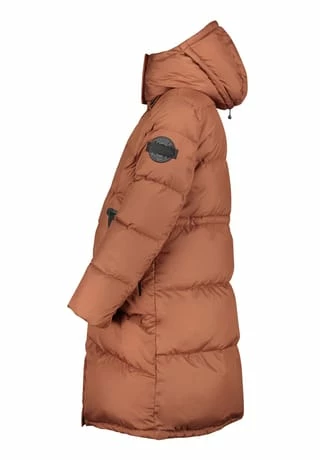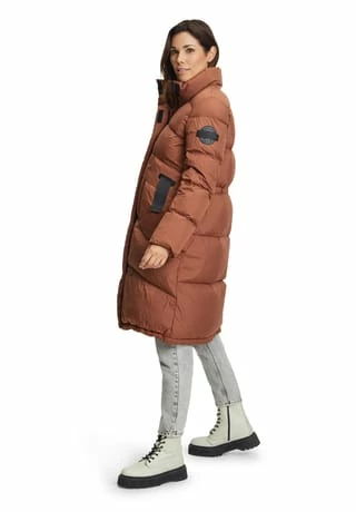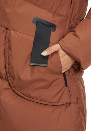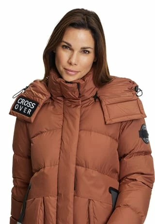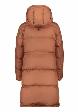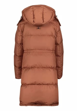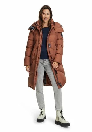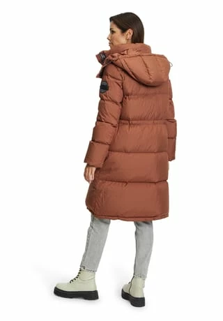 Mit dieser langen, weichen Daunenjacke in leichter A-Linie sind Sie supermodisch angezogen! Die lässige Form hat einen Taillentunnel und edelsportive Taschendetails in Kontrast schwarz. Durch den raffinierten Klettverschluss mit Logo und die beiden Kapuzentunnel lässt sich die Jacke hoch schließen und hält Sie immer schön warm.
