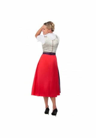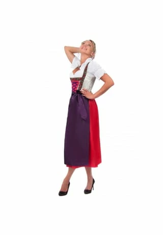 Edles 3 teiliges Designer Dirndl bestehend aus Kleid, Dirndlbluse und Dirndlschürze Das aufwendig gearbeitete gold-beige Oberteil ist mit weißem Baumwollstoff gefüttert und mit einer wunderschönen Rosen-bordüre verziert. Vorne sind silberfarbene Miederhaken und rot-pinke Satinbänder um die Weite individuell zu regulieren. Das Dirndl wird hinten mit einem verdecktem Reisverschluss geschlossen Der rote Rockteil und die lila glänzende Schürze sind schön in Falten gelegt und machen dieses edle Dirndl zu einem absoluten Hingucker! Die weiße Dirndlbluse ist mit elastischem Gummiband unter dem Saum sowie an den Ärmeln eingenäht und wird von feinen, breiten Rüschen vom gleichen Stoff um den Nackenbereich verziert. Mit dem verstellbaren Tunnelzug kann man die Ausschnittstiefe individuell einstellen.