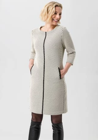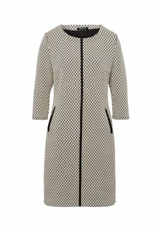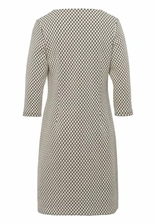 Bezauberndes Kleid, das sich figurumspielend und kniebedeckt zeigt. Raffinesse verleihen ihm die dezente Applikation und die eingearbeiteten schmalen Leistentaschen. Das dezente Jaquard-Muster schenkt dem Style eine Extraportion Charme.