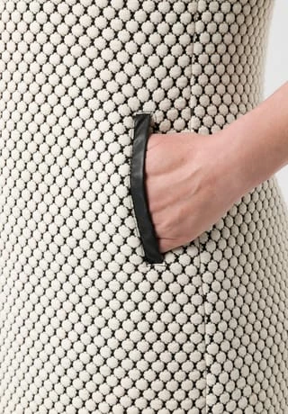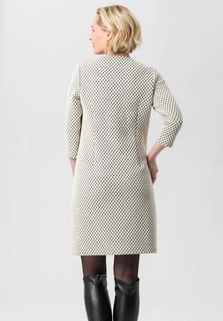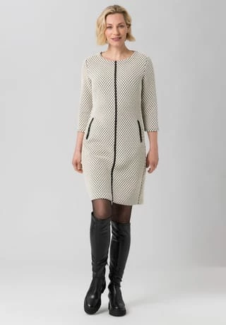 Bezauberndes Kleid, das sich figurumspielend und kniebedeckt zeigt. Raffinesse verleihen ihm die dezente Applikation und die eingearbeiteten schmalen Leistentaschen. Das dezente Jaquard-Muster schenkt dem Style eine Extraportion Charme.