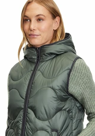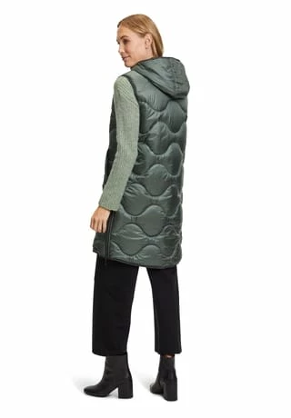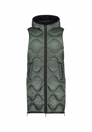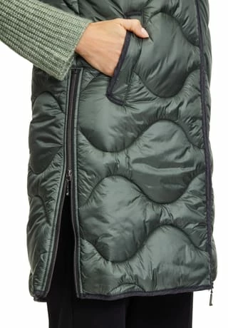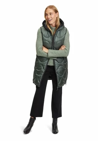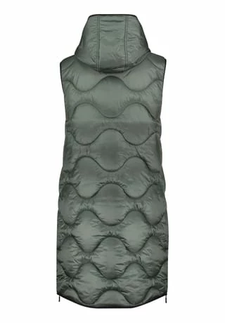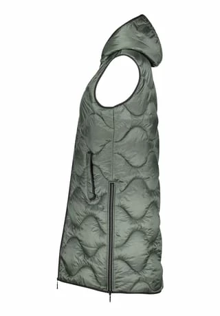 Das könnte Ihr neues Lieblingsteil werden! Modische Sandwich versteppte Longweste der Marke Gil Bret mit einer innovativen Ocean recycled Watte gefüllt, in einer schönen Polyamidware mit Kapuze und und praktischem Zweiwege Reißverschluss vorne. Die Innenseite der Weste ist in Kontrast gehalten.