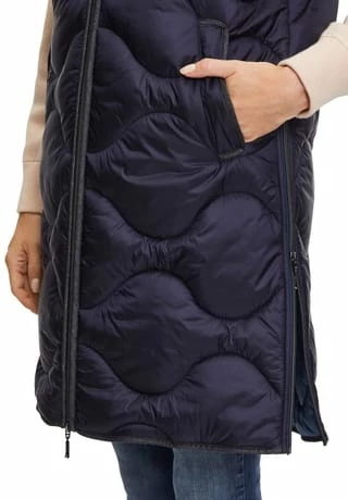 Das könnte Ihr neues Lieblingsteil werden! Modische Sandwich versteppte Longweste der Marke Gil Bret mit einer innovativen Ocean recycled Watte gefüllt, in einer schönen Polyamidware mit Kapuze und und praktischem Zweiwege Reißverschluss vorne. Die Innenseite der Weste ist in Kontrast gehalten.