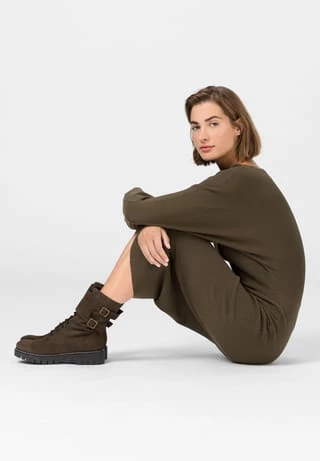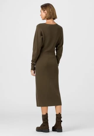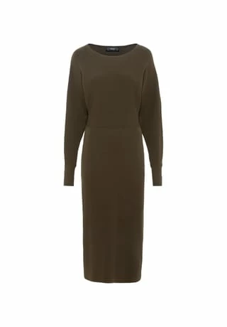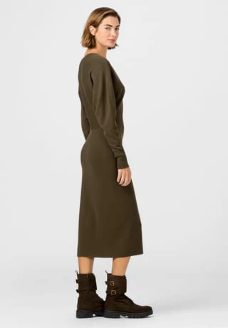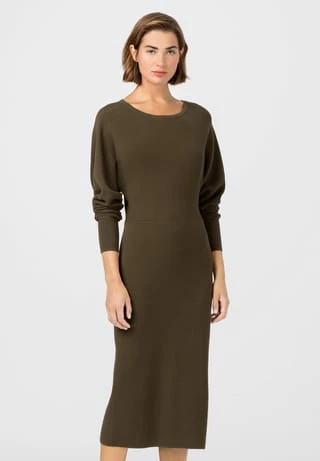 Bietet eine kontrastreiche Silhouette: das wadenlange HALLHUBER Strickkleid mit lässig-weiten Fledermausärmeln und schmal geschnittenem Rock. Mit Oberteil in Linksstrick, halsnahem Rundausschnitt und Taillennaht. Die Qualität: Feinstrick aus softem Viskose-Mix in der Trendfarbe Oliv.