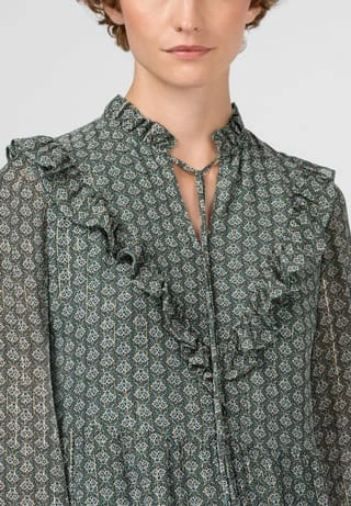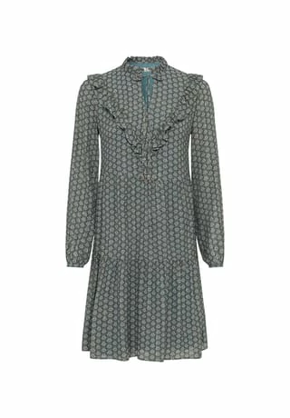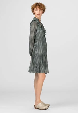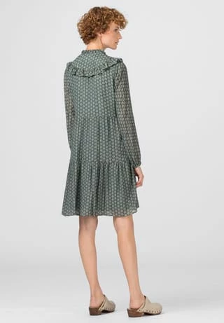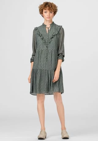 Fusion aus zeitgeistigem Design und edlem Material: HALLHUBER Printkleid im Viskose-Seide-Lurex-Mix mit zartem Minimal-Print aus kleinen Blättern. Das Modell ist mit gerüschtem Stehkragen und Rüscheneinsatz am Oberteil ausgestattet. Die Passform ist locker und figurumspielend gehalten, mit stufigen Volants für eine schwingende Silhouette. Stylen Sie das Modell mit dezentem Schmuck und passender Schultertasche.
