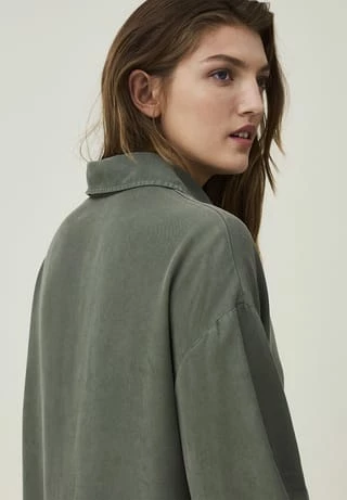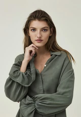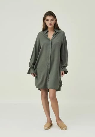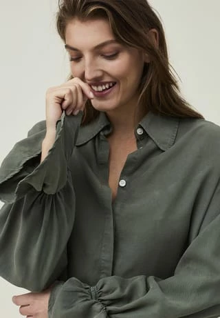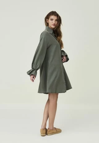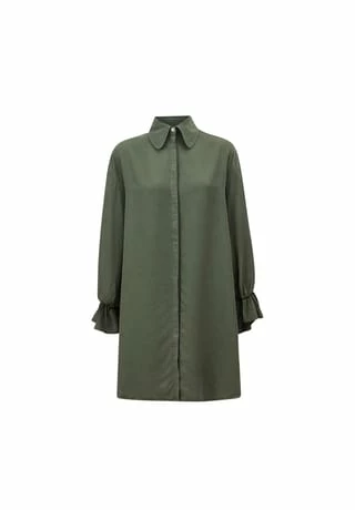 Dieses Kleid aus LENZING™ Lyocell hat eine verdeckte Knopfleiste, einen großen Kragen und lange Ärmel mit einem dekorativen Volant. Bei dem Modell mit A-linienförmiger Silhouette sind die Ärmelabschlüsse elastisch gearbeitet.