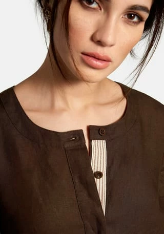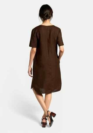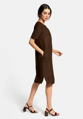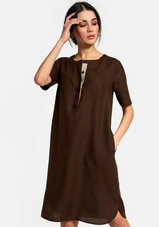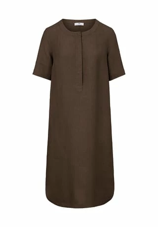 Kleid von PETER HAHN zum Schlupfen mit 1/2-Arm. Für jede Figur, jeden Stil und die schönsten Tage des Jahres! Das Leinen-Gewebe mit den materialtypischen Garnverdickungen sorgt bei sommerlichen Temperaturen für einen kühlenden Effekt. Auch der leicht ausgestellte, locker fallende Schnitt mit gerundetem Saum und Seitenschlitzen trägt zum Wohlfühlen bei. Schönes Deko-Element ist ein gestreiftes Zierband auf dem Untertritt der kurzen verdeckten Knopfleiste. Mit 2 in die Seitennähte integrierten Taschen. 100% Leinen. Länge ca. 100 cm. Dieses Kleid ist maschinenwaschbar.