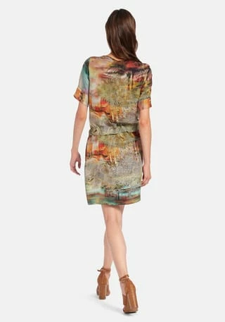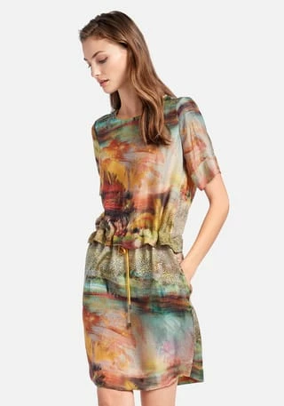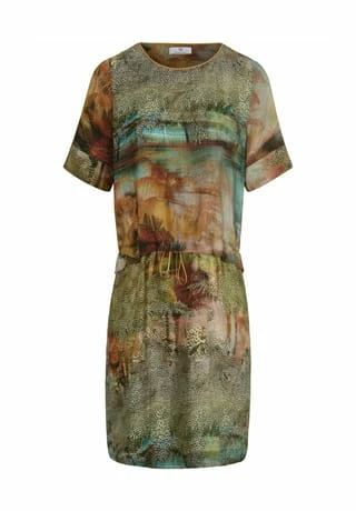 Kleid von PETER HAHN mit 1/2-Arm. Schön fließend und leger mit einem verdeckten Tunnelzug mit Bindeband im Taillenbereich und feinem kontrastfarbenen Zierband am Rundhals-Ausschnitt. Dank dem weich fließenden, feinen Gewebe trägt sich das Kleid auch bei hohen Temperaturen sehr angenehm. Der faszinierenden Print in tollen, brillanten Farben macht jedes Model zu einem Unikat, das Ihr Outfit zum sommerlichen Blickfang macht! 53% Cupro, 47% Viskose. Länge ca. 100 cm. Dieses Kleid ist maschinenwaschbar.