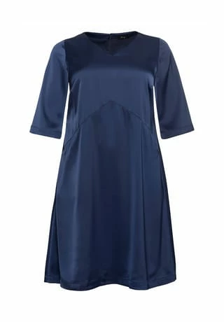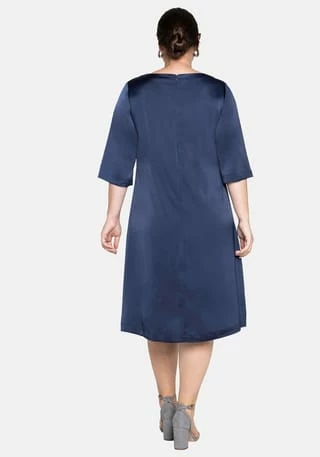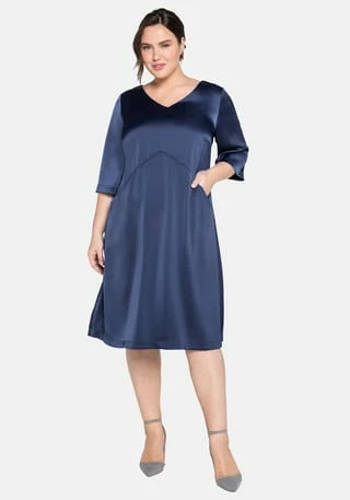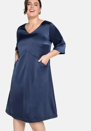 Dieses Cocktailkleid von sheego überzeugt durch seinen modernen und dabei sehr festlichen Auftritt. Es besitzt einen streckenden V-Ausschnitt sowie leicht ausgestellte, 3/4-lange Ärmel. Elegant und bequem zugleich wirkt die weite geschnittene A-Linie, die die Figur gekonnt umspielt. Schräg verlaufende Teilungsnähte formen dazu eine tolle Silhouette. Eingrifftaschen auf Taillenhöhe und ein nahtfeiner Reißverschluss im Rücken ergänzen den Schnitt. Das Kleid ist mit einem elastischen Futter versehen.