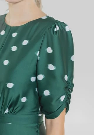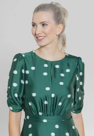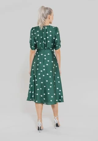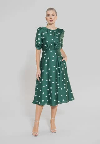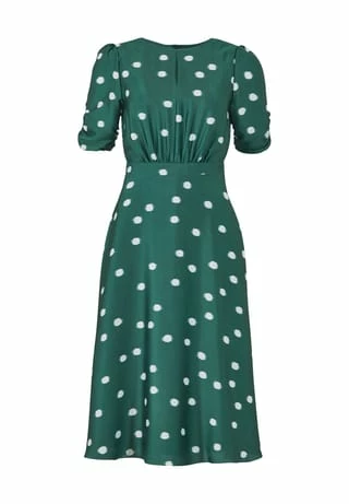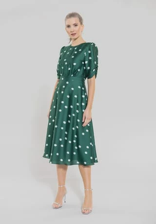 Für besondere Momente und ein apartes Outfit sorgt dieses Cocktailkleid der Marke SWING. Die Midi-Länge und die kurzen Ärmel machen den eleganten Look vollkommen. Das Kleid schmiegt sich dank des Schnittes sanft an den Körper an und betont die schlanke Taille. Dabei ist es ausgestattet mit einem Reißverschluss. Verziert ist das Kleid außerdem mit einer Bordüre und wird auch durch das gepunktete Muster zu einem schönen Hingucker.