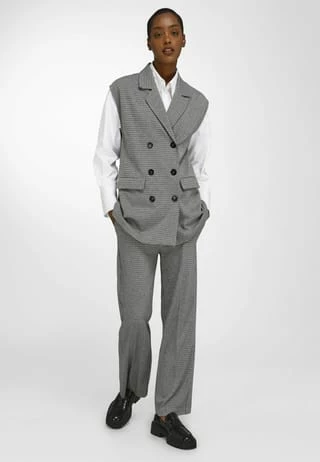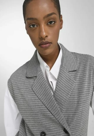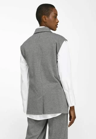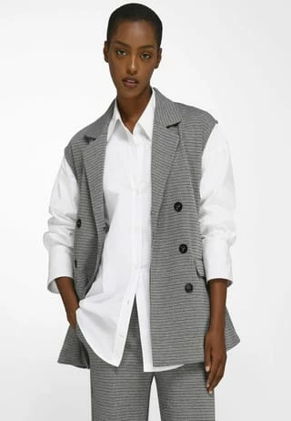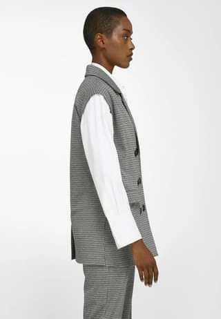 Jersey-Weste von WALL LONDON mit leicht überschnittener Schulter. Der neue Westen-Typ im etwas längeren Blazer-Stil mit doppelreihiger Knopfleiste, Reverskragen und 2 Pattentaschen. Zusammen mit der Hose (3) ein cooles Outfit, das mit hohem Modegrad und bestem Tragekomfort überzeugt. 50% recyceltes Polyester, 30% Viskose, 15% Polyester, 5% Elasthan. Länge ca. 70 cm. Maschinenwaschbar.